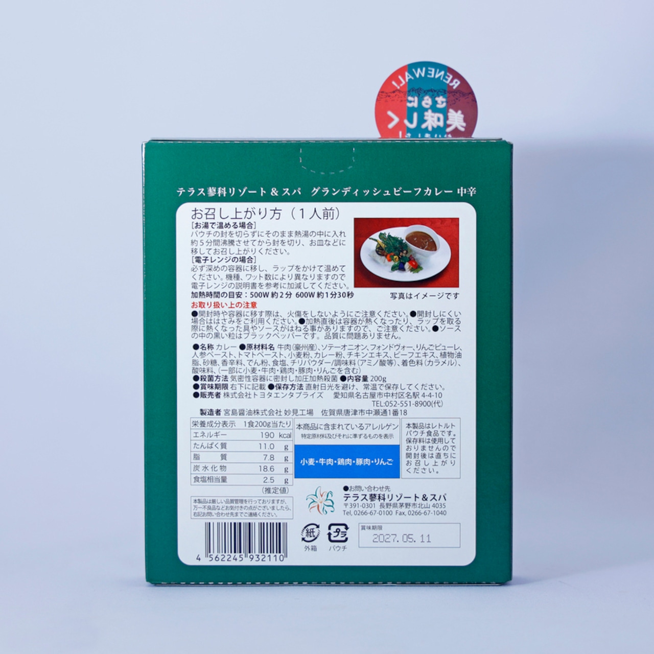 原材料名:牛肉(豪州産)、ソテーオニオン、フォンドヴォー、りんごピューレ、人参ペースト、トマトペースト、小麦粉、カレー粉、チキンエキス、ビーフエキス、植物油脂、砂糖、香辛料、でん粉、食塩、チリパウダー/調味料(アミノ酸等)、着色料(カラメル)、酸味料、(一部に小麦・牛肉・鶏肉・豚肉・りんごを含む)