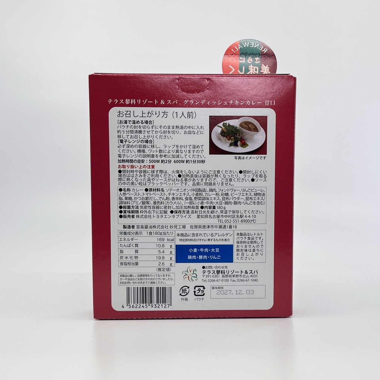 原材料名:ソテーオニオン(中国製造)、鶏肉、フォンドヴォー、りんごピューレ、人参ペースト、トマトペースト、チキンエキス、小麦粉、カレー粉、砂糖、ビーフエキス、植物油脂、果糖、かつお節だし、でん粉、香辛料、食塩、野菜調味エキス、昆布パウダー、昆布エキス/調味料(アミノ酸等)、着色料(カラメル)、(一部に小麦・牛肉・大豆・鶏肉・豚肉・りんごを含む)